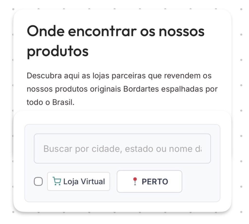 Onde encontrar Bordartes: O consumidor pode digitar o nome da cidade, usar a localização ou o filtro de lojas virtuais.